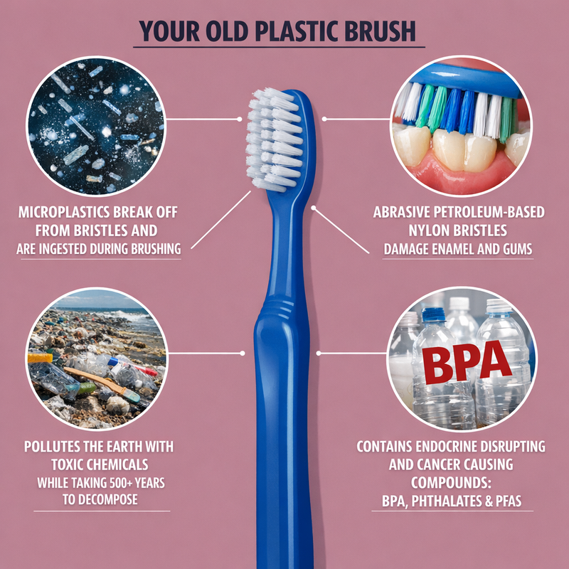 Plastic toothbrushes are made with nylon bristles and of course a plastic handle. Both plastic and nylon are derived from petroleum and contain BPA, phthalates, PFAS and many other carcinogenic and hormone disrupting compounds. As you brush your teeth with these nylon bristles - microplastic fragments are broken off, absorbed, and swallowed.